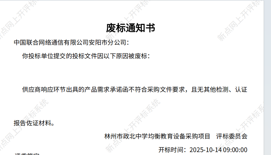 ************************有限公司安阳市分公司经谈判小组评审“供应商响应环节出具的产品需求承诺函不符合采购文件要求,且无其他检测、认证报告佐证材料。”予以废标。 各有关当事人对中标结果有异议的,可以在中标公告期限届满之日起七个工作日内,以书面形式同时向采购人和采购代理机构提出质疑(加盖单位公章且法人签字),依据法规规定,质疑函应当有明确的请求和必要的证明材料。以质疑函接受确认日期作为受理时间,逾期提交或未按照要求提交的质疑函将不予受理。 | |||||||||||||||||||||||||||||||
