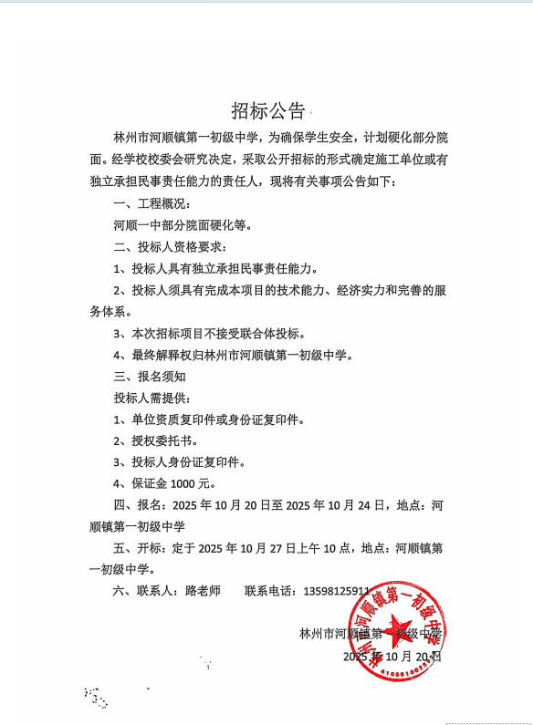 为便于供应商及时了解政府采购信息,根据《河南省财政******学校部分院面硬化 2025年10(至)10月采购意向公开如下: